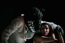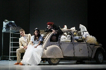 Wie es einem antiken Chor zukommt, tragen die Tänzer (vorzügliche) Masken. Eben noch hatten sich die beiden Schwestern der Schönen vom konkursbedrohten Vater als Mitbringsel von seiner Abwendungsfahrt einen Papagei und einen Affen gewünscht, da tauchen im Zauberwald zwei Tänzerinnen im Kreis des danse macabre auf, mit Masken, morbide wie der Totentanz, an Kindervergreisung erinnernde Äffchen- und Papageienschwestern, die genau dies besagen: Ein Wunsch erzählt alles über den Wünschenden, fällt auf ihn zurück. Subjekt-Objekt-Korrelation der besonderen Art. Jeunesse d' Orée überall, ob der kurzbehoste Bruder Ludovik, knabenhafte Luftsprünge zeigen den Geist des Kinds, der leichtsinnige, zur wahren Liebe noch nicht erlöste Avenant, ob die hübschen Schwestern, denen die Schönheit der Seele fehlt. Dazu passend später der Original-Deuxchevaux, Ikone jedes Adoleszenzverweigerers, in dem Gockel Ludovik mit seinem pickbereiten Kumpan und den Hühnern unterwegs ist, Verlust der Firma hin, Abhandengekommensein der Schwester her. Zurückgebliebene im doppelten Wortsinn.