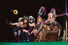 Weil das, was sie in den nächsten zweieinhalb Stunden erleben werden, so abgedreht und größenwahnsinnig ist, dass sie darüber noch ihren Enkeln berichten werden. Im Vorfeld werden auf einer Leinwand auf der Bühne Trailer von Gruselfilmen in schwarzweiß gezeigt. Das überbrückt leichterdings die Viertelstunde Verspätung, bis die Aufführung beginnt.