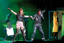 Und wenn die Vorstellungen der Rocky Horror Show auf dieser Welt auch variieren, müssen sie im Grunde nur die Schlüsselpunkte zeigen, die Originalkostüme möglichst originalgetreu nachempfinden und dann können die Darsteller mit der Band und dem Publikum die Feier beginnen. In der Inszenierung von Sam Buntrock gibt es alles, was das Herz des Fans begehrt. Ungehemmt laut dürfen die Darsteller und die Band im Sounddesign von Jon Pitt werden. Es scheint keine Begrenzung der Phonzahlen ohne Qualitätsverluste zu geben. David Howe hat dazu ein Licht entworfen, das alle Register zieht. Selbst die Bühnenumrandung ist noch gut für Leuchtbänder. Scheinwerfer setzen die Darsteller – und das Publikum – prall in Szene. David Farley findet nicht nur die archetypischen Merkmale der Kostüme, sondern schafft auf der überraschend kleinen Bühne auch Platz für all die Phantasien, die O’Brien durch den Kopf geschwirrt sind. Dabei lässt er die Musiker auf einer Empore oberhalb der Bühne Platz nehmen und findet bewusst kleinteilige Requisiten, die schnell ausgetauscht werden können. Im „Showteil“ darf es dann ein gerüschter, pinkfarbener, mehrteiliger Vorhang sein, der beim Publikum Begeisterungsrufe beschwört. Es ist die satte Lust, die das Leitungsteam umtreibt. Und es gibt im Publikum viele, die auf die Abläufe eingeschworen sind und lediglich auf ihr Stichwort warten. Ein ideales Zusammentreffen, das die Stimmung im Nu auf den Höhepunkt treibt.