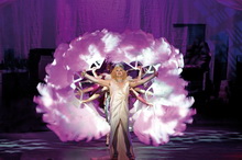 Schon beim Prolog Science Fiction Double Feature von Magenta alias Maria Franzen steigt die Temperatur in der Halle merklich an. Bei Janet scheidet sich in der Regel die Spreu vom Weizen. Da gibt es die Lieblichen, die sich aus der Rolle nicht lösen können. Und da gibt es eine Harriet Bunton, die sich von der Blümchen-Jungfrau zur erwachsenen Frau entwickelt. Stimmlich schafft sie den Spagat locker, aber eben auch darstellerisch. Grandios. Die Rolle der Janet ist dankbar, wenn man die künstlerischen Fähigkeiten besitzt, aber Bunton setzt noch mal eins drauf. David Ribi als Brad singt und spielt rollengerecht. Bekommt Riff Raff Stuart Matthew Price die Grenzen von Buntrock gesetzt oder mag er sich nicht so recht entwickeln? Jedenfalls bleibt die Rolle blass. Anders als die des Frank’n’furter. Rob Fowler spielt sie über die Maßen gut, nutzt die richtigen Gelegenheiten für den Dialog mit dem Publikum, das ihm „aus der Hand frisst“. Er zeigt stimmlich und darstellerisch Souveränität. Er ist der Star, ohne „tuntig“ zu wirken. Großartig. Hannah Cadec als Columbia gelingt ein ausgezeichnetes Falsett, das so glasklar ist, dass die Unterzeichnung der Rolle unbeachtet bleibt. An Rocky gefällt dem weiblichen Publikum in erster Linie der durchtrainierte Körper von Vincent Gray. Trotz Posiererei und güldnem Lockenkopf gelingt es ihm, die Rolle der Albernheit zu entziehen. Wie üblich werden Eddie und Dr. Scott von einer Person dargestellt. Charlie Brunton bekommt das wunderbar hin. Sky Du Mont fehlt die Natürlichkeit – oder besser: Knorrigkeit des Erzählers. Er gibt ihn als „Gentleman“, aber das will nicht so recht funktionieren, und schon gar nicht, wenn er jovial auf das boring des Publikums eingeht. Vor allem die dämlichen Anspielungen auf die Köln-Düsseldorf-Konkurrenz lösen zwar Lacher aus, sind aber wirklich nicht mehr zeitgemäß. Am Ende steht er unbeholfen auf der Bühne rum, und keiner vermisst ihn.