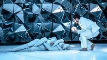 Johan Kølkjær hat den Tänzerinnen und Tänzern des Dänischen Tanztheaters eine so simple wie geniale Bühne bereitet. Vorhang auf. Eine Spur silberfarbenen Konfettis fällt von oben auf die dunkle Bühne. Im Hintergrund hebt sich ein zweiter Vorhang, um den Blick auf die Rückwand der Bühne freizugeben. Aus der erheben sich pyramidenförmige Spitzen, die die kristalline Struktur des Diamanten andeuten. Ideale Projektionsfläche und Quelle für die eindrucksvollen Lichteffekte, für die Jakob Bjerregaard verantwortlich zeichnet. Im ersten Akt ist die Grundstimmung dunkel, wird aber durch wechselnde Reflexe immerhin so weit erhellt, dass die Tänzer im Großen und Ganzen sichtbar bleiben. Im zweiten Akt wechselt das Schwarz des Infernos und der Verzweiflung in das Silber der Hoffnung und Zukunft – na ja, zumindest ist es von Rushton so gedacht, aber es wird wenigstens von fahl zu weiß und hell. So werden auch die fantasievollen Kostüme von Charlotte Østergaard deutlich sichtbar. In diesem kontrastierenden Szenario gelingt es Rushton, eine eigene Welt entstehen zu lassen. Dazu hat er zeitgenössische Musik von Trentemøller, dem Balanescu Quartet, Donnacha Costello, Philip Glass und Tom Opdahl ausgewählt, die im Forum lediglich als Konserve zu hören ist. Sie reicht von der lyrisch klagenden Geige bis zum wummernden Disco-Beat und wieder zurück.