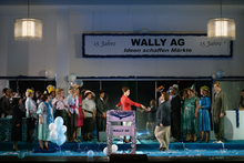Regisseur Tilman Knabe erzählt im Nationaltheater Mannheim die Geschichte einer Frau, die sich auflehnt und ausbricht, die sich als Geschäftsfrau selbst verwirklicht und darüber ihre Liebe zurückstellt. Zwar weiß sie, wer der Richtige wäre, doch sie kommen nicht zusammen. Warum? Die schlüssige, wenn auch eindimensionale Antwort wäre, weil ihr das Business wichtiger ist. Denn immerhin prosperiert die Wally AG seit 15 Jahren, und die Inhaberin kommt elegant daher, während sie doch in der Jugend Flippiges bevorzugt hat.