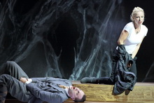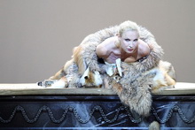 Die Geschichte der dank des Verjüngungstrunks 300-Jährigen erzählt Schilling dann doch recht konventionell, vertraut seiner Muttersprache des dialoglastigen Werkes, während die überforderten Übertitel der Staatsoper munter Zeile für Zeile flimmern. Allein ausgedeutet wird die ewige Unterwerfung der männermüden Diva, die am Ende als Opfer ihrer Exponiertheit vor dem männlichen Pranger für ihre Zeitlosigkeit bestraft und ausgepeitscht wird. Die Strafe für ihr Weltwissen gibt sie dann, nicht dem Libretto gemäß, der jungen Sängerin Krista weiter, die wohl die nächsten 300 Jahre in einer emotionalen Eiszeit verbringen wird. Die zurückgenommene Personenregie mit wenig Bewegung und oft erstarrten Männern konzentriert sich ebenfalls auf die Marty, die physisch und psychologisch ausgestellt wird.