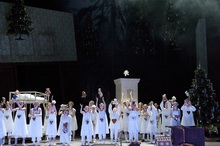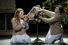 Dagegen leitet die Musik dieser beliebten Oper den Zuschauer durch alle Untiefen des Verstehen-Wollens, lullt ihn ein, trägt ihn weiter, auch wenn er sich bisweilen, etwa zu Beginn des dritten Bildes, etwas langweilt. Guido Johannes Rumstadt führt die Staatsphilharmonie Nürnberg sicher und umsichtig; schon in der Ouvertüre, sanft beginnend mit dem Abendsegen-Motiv, werden alle wichtigen Themen ausgebreitet, gewinnen an Farbe, nicht immer an Kontur, steigern sich schicksalhaft. Auch wenn später Sänger und Orchester manchmal etwas auseinanderdriften, der satte, runde Klang, die Durchsichtigkeit an den feinen Stellen, die ausgezeichneten Bläser gefallen sehr. Von den Personen schlägt sich am besten Jochen Kupfer in seinem Rollendebüt als Vater Peter, imponiert vor allem mit seiner angenehm klingenden, präsenten, nie angestrengten Stimmkraft. Als seine Frau Gertrud kann Ekaterina Godovanets ihren dramatischen Sopran wirkungsvoll einsetzen. Bei Hänsel und Gretel hätte man sich vielleicht mehr Unterschied in Stimmcharakter und Stimmfarbe gewünscht, doch Silvia de La Muela, ein nicht allzu dunkler, sicher geführter Mezzosopran, gestaltet ihre Hosenrolle frisch und sehr glaubhaft, und Michaela Maria Mayer, mit einem nicht allzu hellen Sopran ausgestattet, mimt die besorgte größere Schwester mit gespielter Naivität. Als Knusperhexe kann Leila Pfister mit stimmlicher Durchschlagskraft und Strenge vor allem Boshaftigkeit vermitteln, während Csilla Csövári als Sandmännchen und Taumännchen mit hellem Sopran glänzen darf. Mit einem wunderschön klingenden Schlussbild überrascht der große Nürnberger Jugendchor des Lehrergesangsvereins, geleitet von Barbara Labudde, als glückliche Schar der erlösten Lebkuchenkinder.