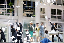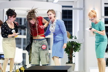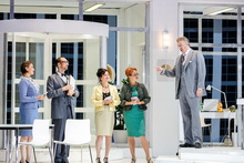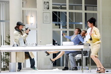 Der in Echtzeit ablaufende Plot wird in einem modernen, eleganten mehrstöckigen Bürogebäude, das von Johannes Leiacker erdacht wurde, in heutigen Kostümen von Marie-Luise Walek in mehreren Ebenen mit größter Rasanz abgespult. Dafür sorgt Josef Ernst Köpplinger, Intendant des Staatstheaters am Gärtnerplatz, das auch als Koproduzent auftritt. Von den zahlreichen Nebenhandlungen, etwa ein ständig Fische fütternder Sekretär im ersten Stock, den Gags und Slapsticks, der Präzision in der Personenführung, den unendlichen Details, worin er sich wieder als Meister erweist und worin man ihn vor München auch am Stadttheater Klagenfurt vier Jahre lang als Intendant und Regisseur schätzte, wird man atemlos mitgerissen.