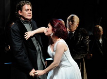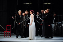 Schon vor der Ouvertüre öffnet sich der Vorhang, und Tannhäuser verabschiedet sich etwas überhastet von Elisabeth, oder ist es doch Venus? Das Bacchanal, charakteristisch für die Pariser Fassung, zeigt ein Dutzend junger Frauen, in langen, weißen durchsichtigen Kleidern mit einer einheitlichen Maske und einer Rose in der Hand. Ein Hinweis auf die Beliebigkeit und Austauschbarkeit der Objekte sexueller Begierde? Doch hier ist Heinicke nicht konsequent genug, und das Bacchanal ähnelt mehr einer steifen Blumenmädchenszene im Parsifal und weniger einer ausschweifenden Orgie in der Lustgrotte der Venus. Venus ist zwar attraktiv, aber sie ist keine klassische Verführerin. Tannhäuser entzieht sich ihr, doch sein Leiden, den Venusberg zu verlassen, kommt nicht wirklich rüber. Ansonsten ist die Inszenierung eher brav und konventionell. Die Pilger machen sich im dunklen Büßergewand auf den Weg nach Rom und kehren im weißen, unschuldigen Kleid zurück. Nur Tannhäuser, der keine Vergebung gefunden hat, kehrt im dunklen Büßergewand zurück. Szenisch gut angelegt mit intelligenter Personenregie der Sängerkrieg im zweiten Aufzug. Die polarisierenden Auftritte der höfischen Minnesänger versus dem Rebell Tannhäuser, das ist auch für Elisabeth zu viel.