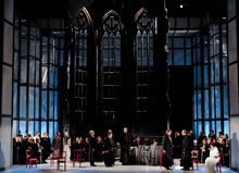 Peter Sykora hat die Bühne als Einheitsbild gestaltet. Mittelpunkt ist eine dreiteilige Ruine aus gotischen Kirchenfenstern, die im zweiten Aufzug den Mittelpunkt bildet und im ersten Aufzug nach links und im dritten nach rechts versetzt wird. Dieses Bild gibt der Inszenierung einen soliden Rahmen und lässt Freiheiten in der Personenregie zu. Seine Kostüme orientieren sich eher an der Entstehungszeit des Werkes als an dem historischen Vorbild, was den optischen Eindruck aber nicht stört.