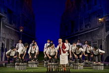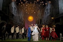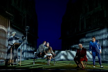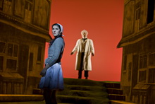 Am Anfang zwitschern die Vögel und die Morgendämmerung bricht herein über das heruntergekommene Viertel Montefiascone. Noch unbemerkt von den Bewohnern zieht Prinz Ramiro im benachbarten Hotel ein, um auf Brautschau zu gehen. So inszeniert Regiedebütant Erik Petersen den Auftakt zu Rossinis Belcanto-Märchen La Cenerentola, die italienisch-quirlige Version von Aschenputtel, ohne Fee und böser Stiefmutter, dafür mit weisem Berater und trotteligem Vater. In dessen ruinöser Behausung und im Schloss des Prinzen spielt die eigentliche Handlung. Dementsprechend irritierend ist zunächst die offene Gasse, die fluchtpunktartig nach hinten zuläuft, als gewählte Spielfläche, doch entpuppt sich das Bühnenbild von Tatjana Ivschina als Clou der Aufführung. Die unscheinbaren, bühnenhohen Häuserkulissen enthalten die Gimmicks der Spielorte, die sich bei Bedarf in die Gasse schieben lassen. Während die Mauern im pauschalen Schwarz-Weiß gehalten sind, bekennen Ivschinas Kostüme Farbe: Giftiges Warnsignal-Rot für die zickigen Schwestern, tristes Grau für das Aschenputtel. Der Prinzenanzug im virilen Blau will dem völlig überforderten Kammerdiener Dandini, der den Prinzen spielen muss, nicht so recht passen und reist prompt an den Nähten auf.