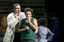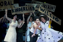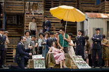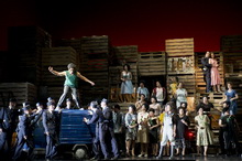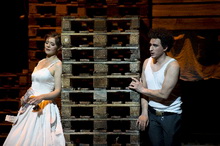 Vielleicht liegt es am ersten sonnigen Sonntag, dass zur Premiere des Liebestranks teilweise ganze Reihen im hinteren Parkett fast leer bleiben. Es ist ein trister Anblick. Vielleicht sind die Dortmunder eine ebensolche Arbeitergesellschaft, wie sie Regisseur Christian Tschirner im Liebestrank als Grundlage sieht. Der legt Donizettis Oper nur auf den zweiten Blick als Romanze an. Wenn sich der eiserne Vorhang ein Stück weit hebt, blendet den Zuschauer als erstes der sonnenartige Scheinwerfer. Ein ganzer Haufen Landarbeiter drängt sich unter dem Vorhang her nach vorne in den Schatten, so wie es auch vom Libretto vorgesehen ist. Der zweite Blick der Zuschauer fällt auf die riesigen Türme aus Holzpaletten, die Aljoscha Begrich auf die Bühne gewuchtet hat. Von italienischer Ländlichkeit keine Spur, stattdessen triste Arbeitnehmer-Tristesse im untersten Niedriglohnsektor. Dass Adina hier die Chefin ist, kann man höchstens daran erkennen, dass Nemorino ihr wie ein lieber Hund hinterher dackelt. Auch die Kostüme von Esther Krapiwnikow übernehmen gesellschaftliche Abgrenzung. Dienstliche Autorität strahlt Belcore samt Polizei-Einheit aus, die Adinas Arbeiter mit Schlagstöcken auf illegale Einwanderer und Schwarzarbeiter untersucht. Die Palettenstadt verliert ihre Reize allerdings in den ersten 20 Minuten, auch wenn die Darsteller in schwindelerregender Höhe zu singen haben. Daran ändert auch der unermüdliche, fast nervige Einsatz der Drehbühne im zweiten Akt nichts. Im ersten Akt hat die Bühne immerhin den Vorteil, die Sänger von allen Seiten im Klang zu stützen, während beim relativ offenen zweiten Akt gleich eine Spur weniger kommt. Bei Tschirner kommt zunächst das Gefühl auf, dass nach 20 Minuten sein Konzept Geld gegen Liebe schon ausgespielt hat, so traditionell harmlos spult er die Komödie um den verliebten Nemorino ab. Doch im zweiten Akt findet er seine Linie wieder. Selten hat man so deutlich gesehen, dass es das reiche Erbe seines verstorbenen Onkels ist, das Nemorino, der eben noch der Klassenclown war, zu einem attraktiven Mann macht. Die Chordamen laufen ihm mit Schildern nach, auf denen recht eindeutige Angebote stehen. Auch für Adina ist das der Punkt, wo sie ihn als vollwertigen Mann anerkennt. An der Stelle lässt Tschirner es rote Rosen regnen und bricht den pseudokitschigen Moment sofort wieder: Nach den Blättern schlagen ganze Bündel der Blumen wie Bomben neben dem Liebespaar ein, das sich schnellstens in Sicherheit bringt. Sterile Arbeiter beginnen die Rosen in Kisten zu packen – das Geschäft mit der Romantik boomt. Nemorino, der weiß, wem er sein Glück zu verdanken hat, schaut nun im Anzug der Arbeit zu. Dulcamara preist zwar noch die Vorzüge seiner Tränke, sieht aber eher wie der Gewerkschaftsgründer der näheren Zukunft aus. Und Belcore versucht sein Brautkleid schon an die nächste Frau zu bringen. Der Traum von bedingungsloser Liebe geht hier nicht auf. Tschirner zeigt das ohne moralischen Zeigefinger, dafür aber mit einer schönen Prise Humor, was ja auch dem Geist der Musik entspricht.
