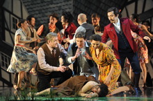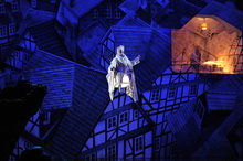 Vor allem aber dann, wenn es in die Hände eines erfahrenen Regie-Teams kommt, das keine Angst vor Größe hat. Johannes Schmid liefert hier ein Meisterwerk ab, das in anderthalb Stunden alles bietet, was große Oper haben muss, um den ganz eigenen Zauber zu entfalten. Die eine Seite ist Schmids Personenführung, die keine Wünsche offen lässt und ein lebendiges, abwechslungsreiches Schauspiel ermöglicht. Hier steht keiner an der Rampe, und niemand muss sich die nächsten Schritte überlegen. Eins greift ins andere, ein wunderbarer Fluss entsteht. Selbst die gefürchteten Längen zum Ende hin bleiben schlicht aus. Die andere Seite ist die – wieder mal – großartige Arbeit von Tatjana Ivschina. Sie hat eine Bühne geschaffen, die in ihrer Detailfreude, überraschenden Wendungen und großer Fantasie einlädt, sich ganz und gar in die Geschichte hineinziehen zu lassen. Dabei nutzt sie die Räume in allen Ebenen, schafft ungewöhnliche Perspektiven und kommt mit denkbar wenigen Umbauten aus, die quasi en passant passieren. Dass es dazu stimmige Kostüme gibt, ist fast schon selbstverständlich. Herrlich, wie Ivschina beispielsweise die Schützen charakterisiert. Fast möchte man den Namen des Schützenvereins benennen, weil man die Typen doch alle wiedererkennt. Ausgeleuchtet wird das Geschehen zumeist treffend und stimmungsvoll von Volker Weinhart. Und weil in einer „richtigen“ Oper auch die Choreografie nicht fehlen darf, zeigt Anna Holter mit ihren Tänzerinnen und Tänzern mal, was da eigentlich alles geht. Vor allem der große Freudentanz gegen Ende ist ein Feuerwerk choreografischer Möglichkeiten, dass einem Hören und Sehen vergeht.