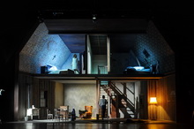 Norman Heinrich öffnet mit seinem Bühnenbild einen Guckkasten in die Psyche zweier Frauen. Die Gemeinschaft der Schwägerinnen ist auch räumlich verwickelt, denn die Brüder und ihre Frauen leben im selben Haus. Ein kinderloser Doppelhaushalt mit gemeinsamer Küche und Wohnzimmer unten und separierten Schlafzimmern oben, damit gestaltet Bühnenbildner Norman Heinrich die Bühne zum überdimensionalen Puppenhaus, das den Zuschauer hinein nimmt in die Geschehnisse.