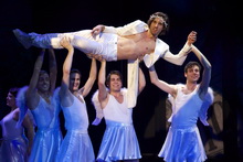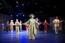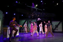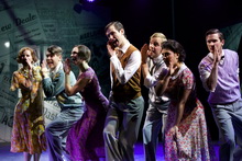 Ricarda Regina Ludigkeit inszeniert und choreographiert diese irre Tour mit künftigen Absolventen der Musicalklasse der Bayerischen Theaterakademie, die im vierten oder dritten Jahr ihrer Ausbildung stehen. Die Premiere bildet damit Abschlussball, Headhunting und Probetanzen zugleich. Das Spielalter des jungen Ensembles, dessen hungrige Begeisterung und der Off-Charme des, dem Münchner Prinzregententheater angegliederten Akademietheaters verströmt im besten Sinne die gewollte Atmosphäre einer guten Schulvorstellung. Bühne und Inszenierung folgen diesem Ansatz. In Rainer Sinells Ausstattung aus zeitungsbespannten Stahlträgern, Brillantine-gegeltem Haar und putzigen Vintage-Klamotten lebt der Geist des vergangenen moralischen Rigorismus der USA von neuem auf. Wenn Sperrholzbäumlein und Flugzeugattrappe über die Bühne gerollt werden, spürt man den Charme von jungem und vergangenem Spiel. Die nebelverhangene Kifferhöhle von Bühne funktioniert mitunter auch durch das eindeutige Hanfparfum, das in die Zuschauerränge dringt.