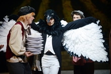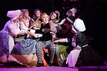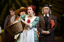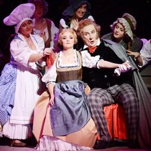 Also dachte sich Regisseur Andreas Beuermann für seine bejubelte Inszenierung am Würzburger Mainfranken Theater etwas Anderes aus: Bei ihm huscht eine „lebendige“ Elster als Unheilsbote durch die Szene, verkörpert von einem Tänzer. Und die Handlung selbst changiert zwischen Realismus und Märchen. Einerseits spielt sie zur Zeit der napoleonischen Kriege, sichtbar an den Uniformen, und greift ein Geschehen auf, das wirklich passiert ist: Eine Dienstmagd wird wegen eines kleinen Diebstahls zum Tod verurteilt, denn so sieht es das Kriegsrecht vor. Während aber in Wirklichkeit das arme Mädchen sterben musste, geht das Ganze bei Rossini und seinem Librettisten Giovanni Gheradini gut aus: Im letzten Moment wird entdeckt, dass die Elster der Dieb war, und die unschuldige Ninetta wird gerettet. Regisseur Beuermann betont andererseits bei seiner ersten Operninszenierung das Märchenhafte und dazu passend den moralischen Sieg des Guten über das Böse, über den Podestà, den verschlagenen Bürgermeister mit seinen sexuellen Absichten, seiner korrupten Amtsführung, seiner ungesetzlichen Anmaßung. Er wird schließlich weggejagt. Doch was passiert mit der Elster? Abgesehen von ein paar Federn, die sie beim Schuss verliert, scheint sie weiter ihr Unwesen treiben zu können. Der zeitliche Hintergrund der Handlung, der Anfang des 19. Jahrhunderts, wird dabei nicht verlassen. Die biedermeierlichen, bunten, sehr abwechslungsreichen Kostüme von Götz Lancelot Fischer kennzeichnen die Mitglieder der Dorfgemeinschaft als Träger verschiedener Berufe und Altersgruppen, wobei ein gewisser Hang zur Übertreibung und Karikatur – spitze Nasen, riesige Hauben und jede Menge lustiger Einfälle – dem Ganzen den Ernst nimmt und komische Momente aufblitzen lässt. Es herrscht ständig reges Treiben, ob nun der Herr Pfarrer, die Waschfrauen, die dicke Bäckerin sich auf dem Dorfplatz treffen, Oma und Opa sich auf ihren Stock stützen, Lausbuben herumflitzen oder ein Kurzwarenhändler an die Türen klopft. Dazwischen immer die Elster. Wie sie flügelschlagend, hüpfend oder niederkauernd quasi im Verborgenen am Dorfleben teilnimmt und dieses durcheinander bringt, kann Ivan Alboresi bedrohlich und mit geschmeidigen Bewegungen bestens im Tanz ausdrücken. Insgesamt aber wirken manche Szenen wie aus einem heiteren Märchen-Bilderbuch. Die Bühne von Herbert Buckmiller zeigt ein kleines Dorf mit freundlichen Häusern und einer Kirche an den Seiten, einem Platz mit Bank und Dorflinde in der Mitte, den Blick auf Weinberge in der Ferne oder auf einen nächtlichen Sternenhimmel. Alles atmet ländliche Idylle, nur manchmal wird es durch Licht verzaubert oder geheimnisvoll verdüstert, wenn über das Schicksal der armen Ninetta durch das vom Bürgermeister bestochene Dorf-Gericht entschieden wird. Die Zuschauer aber werden schon bei der Ouvertüre auf den künftigen Gang der Handlung vorbereitet. Da taucht die Elster bereits auf, versteckt sich, während ein Trauerzug den verstorbenen Podestà zu Grabe trägt und der neue Bürgermeister eintrifft, der alles Unheil verursacht.